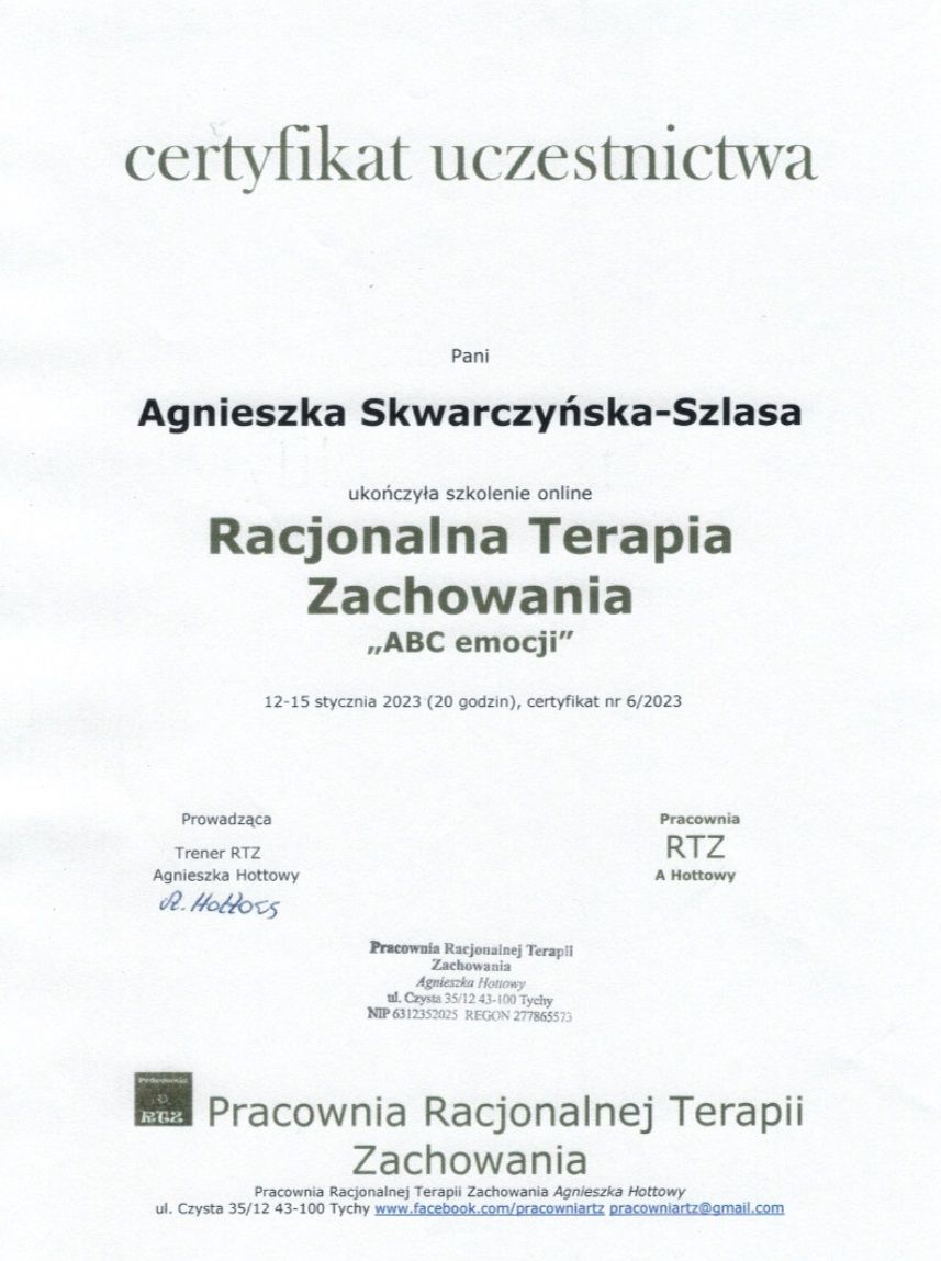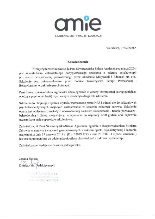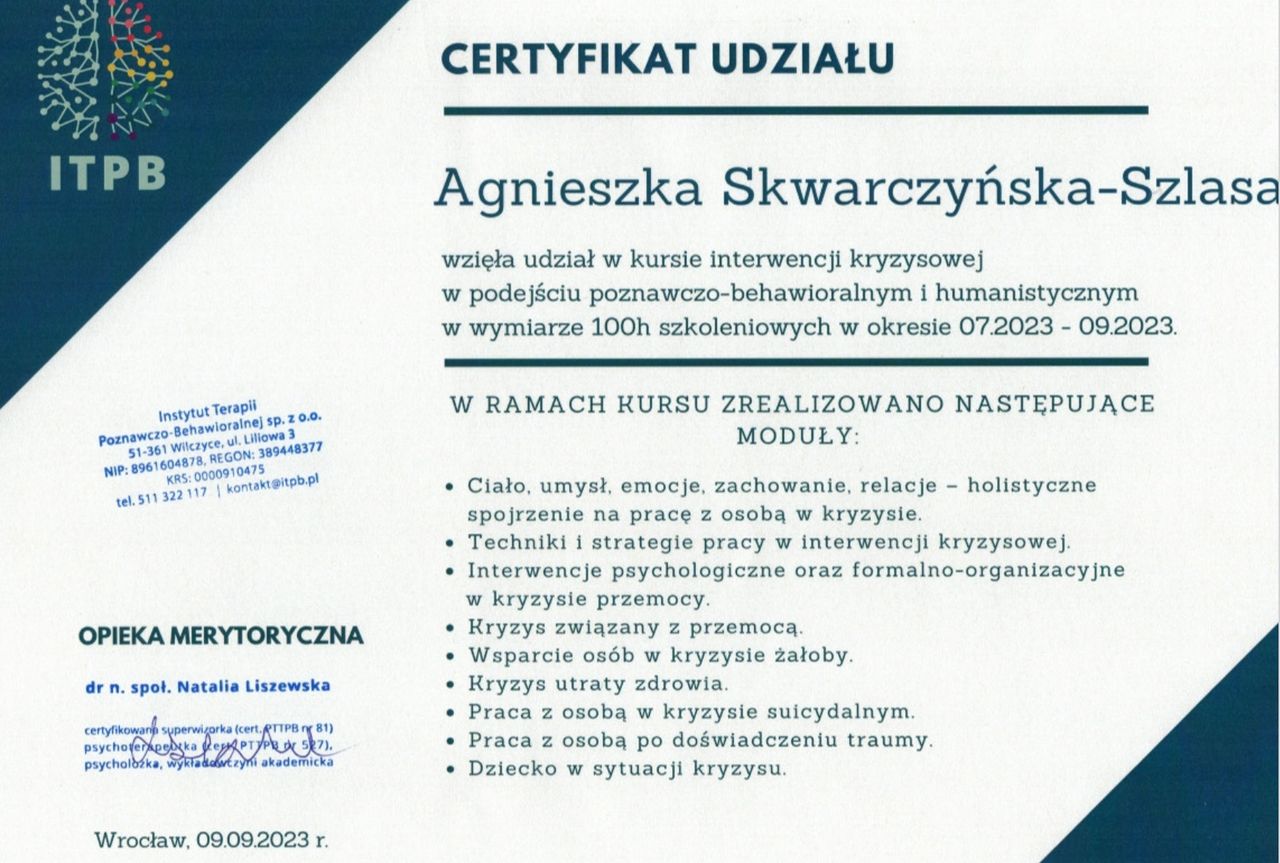 Ukończyłam studia magisterskie z psychologii na Uniwersytecie SWPS oraz studia podyplomowe z psychoonkologii. Brałam udział w licznych kursach i szkoleniach, m.in. z zakresu racjonalnej terapii zachowania, interwencji kryzysowej w podejściu poznawczo-behawioralnym i humanistycznym oraz terapii dzieci i młodzieży opartej na ACT. Regularnie poddaję swoją pracę superwizji, aby stale podnosić jakość świadczonej pomocy.
